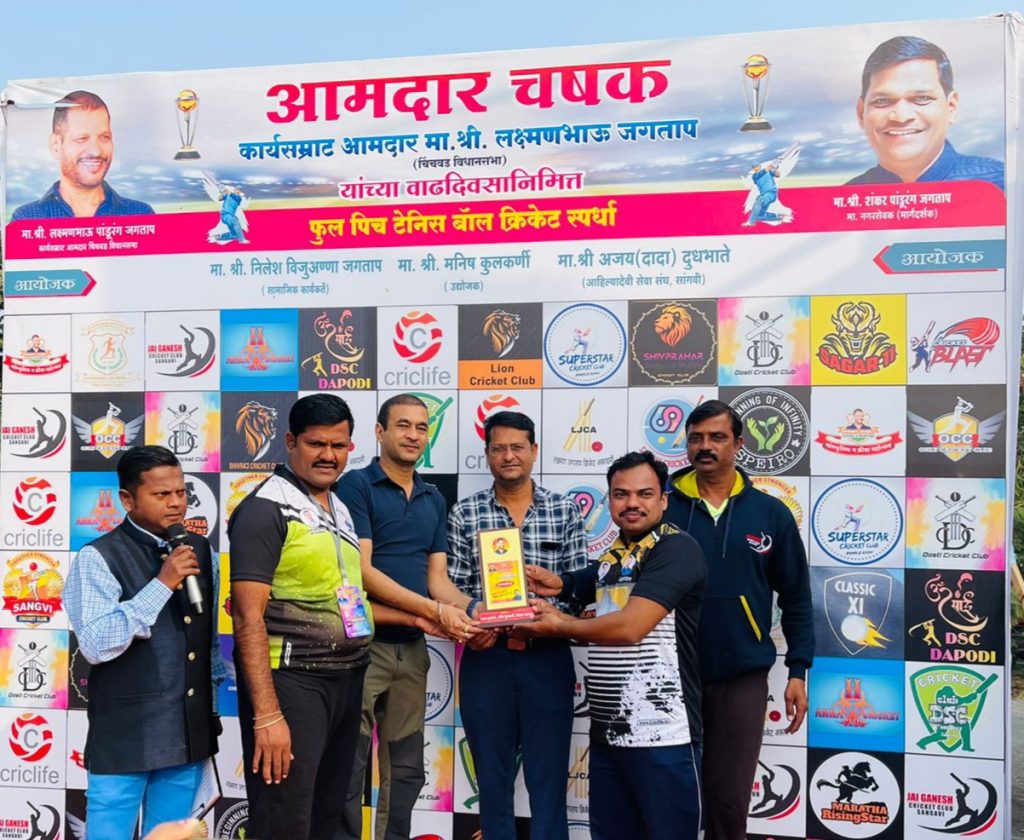 सांगवीतील आमदार क्रिकेट चषक स्पर्धेतील मैत्री सामन्यात punetoday9news चे संपादक सागर झगडे सन्मानचिन्ह स्वीकारताना.