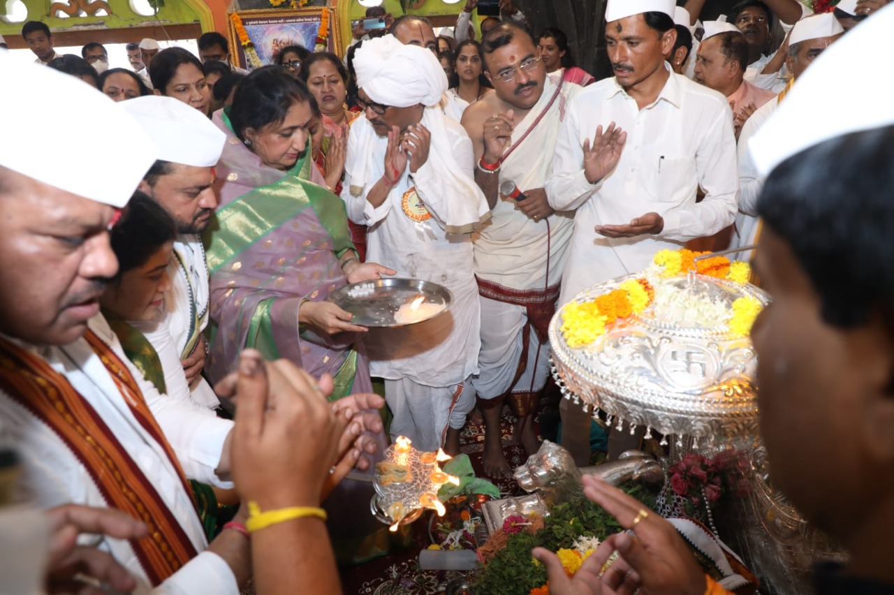 देहू मंदिरात खासदार श्रीरंग बारणे यांनी सपत्निक पादुकांचे पुजन आणि आरती केली. यावेळी आमदार रोहित पवार, सुनील शेळके, माजी आमदार उल्हास पवार यांच्यासह बारामती हाय-टेक टेक्स्टाईल पार्कच्या अध्यक्षा सुनेत्रा पवार पूजेला उपस्थित होते. त्यानंतर उपस्थित सर्वजण वारकऱ्यांसह टाळ-मृदुंगाच्या गजरात दंग झाले. यावेळी जगद्गुरु श्री संत तुकाराम महाराज संस्थानचे अध्यक्ष ह.भ.प. नितीन मोरे, पालखी सोहळा प्रमुख माणिक मोरे, संतोष मोरे, विशाल मोरे, संस्थांचे विश्वस्त संजय मोरे, भानुदास मोरे, अजित मोरे आदी उपस्थित होते.