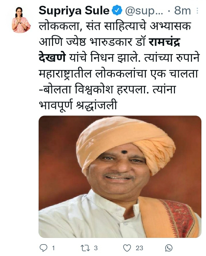 संत साहित्याचे गाढे अभ्यासक, प्रवचनकार आणि भारुडकार डॉ. रामचंद्र देखणे यांचे निधन झाल्याची दुःखद वार्ता समजली. त्यांना भावपूर्ण श्रद्धांजली! त्यांच्या आत्म्यास चिरशांती लाभो, हीच आई-जगदंबेचरणी प्रार्थना! pic.twitter.com/TxZhMgX2Ab