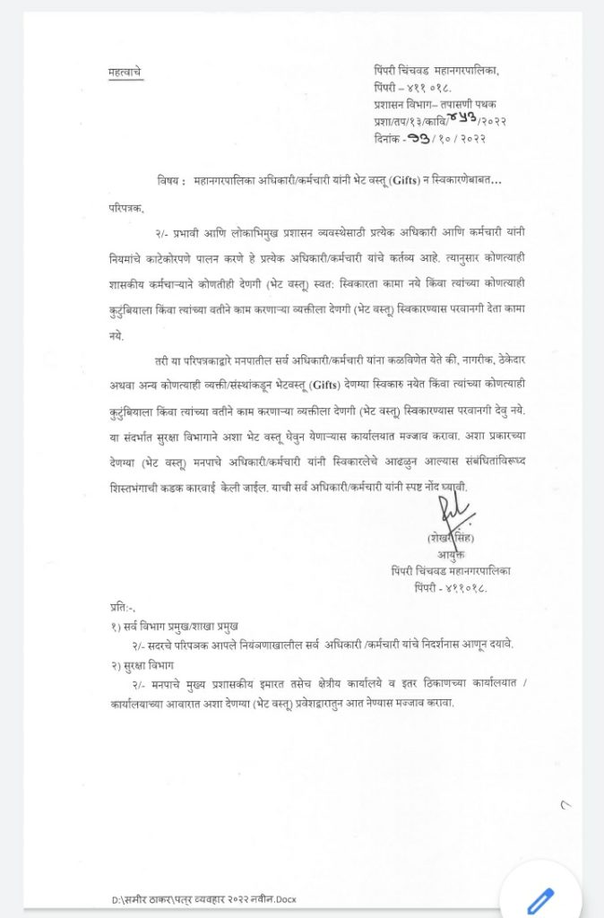 पिंपरी, दि. १४( punetoday9news):- दिवाळीच्या पार्श्वभूमीवर, पिंपरी पालिकेचे अधिकारी व कर्मचाऱ्यांनी कोणत्याही प्रकारच्या भेटवस्तू अथवा देणगी स्वीकारू नयेत, अशी लेखी सूचना प्रशासक तथा आयुक्त शेखर सिंह यांनी दिली आहे. या आदेशाचे पालन न करणाऱ्यांच्या विरोधात शिस्तभंगाची कारवाई करण्यात येईल असे सांगण्यात आले आहे.