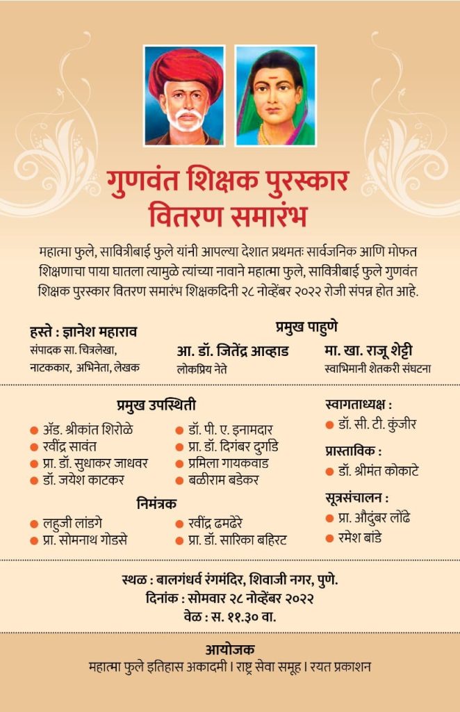 हा पुरस्कार लेखक व नाटककार ज्ञानेश महाराव, आमदार डॉ. जितेंद्र आव्हाड आणि स्वाभिमानी शेतकरी संघटनेचे नेते राजू शेट्टी यांच्या हस्ते दिला जाणार आहे.