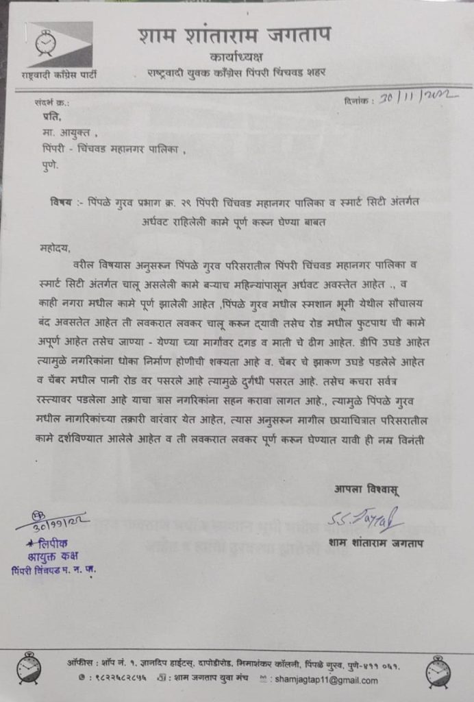 पिंपळे गुरव परिसरात महापालिका व स्मार्ट सिटी अंतर्गत सुरू असलेली कामे अद्यापही अर्धवट अवस्थेत असून ती लवकर पूर्ण करावी या संदर्भात राष्ट्रवादी काँग्रेसचे माजी शहर कार्याध्यक्ष शामभाऊ जगताप यांनी महापालिका आयुक्तांना निवेदन दिले असून, स्मशानभूमीच्या समस्या सोडविण्याची मागणी केली आहे.