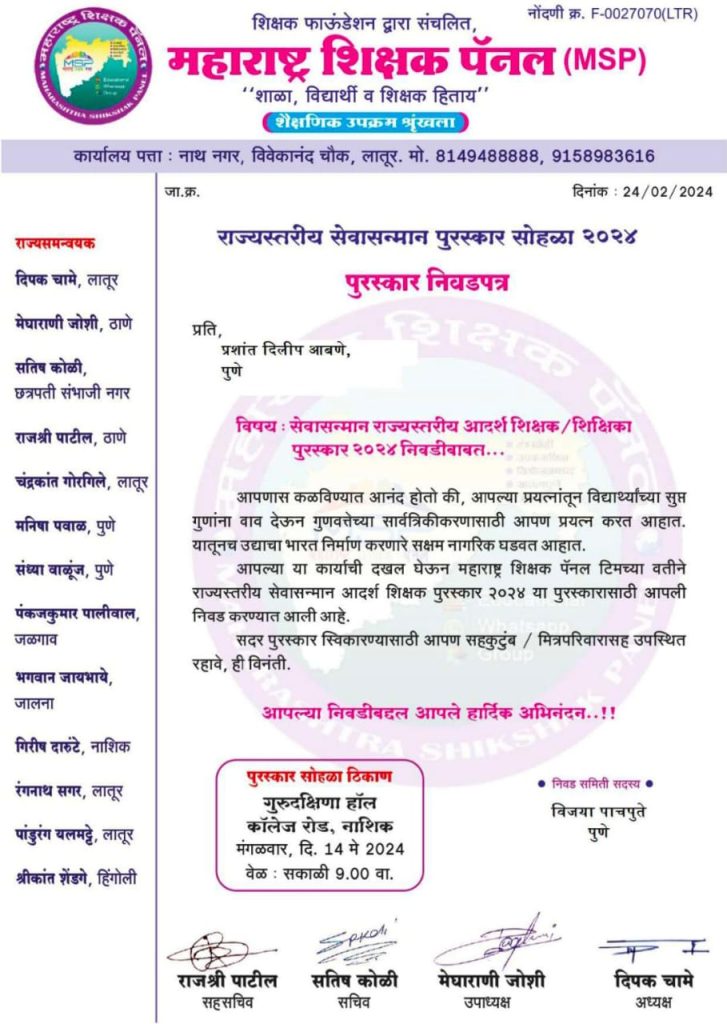 पुणे,दि.३ :- शिवछत्रपती क्रीडा संकुल पुणे येथील क्रीडा प्रबोधिनी विद्यालयातील कार्यरत शिक्षक प्रशांत आबणे यांना महाराष्ट्र शिक्षक पॅनल कडून राज्यस्तरीय आदर्श शिक्षक पुरस्कार जाहीर झाला.