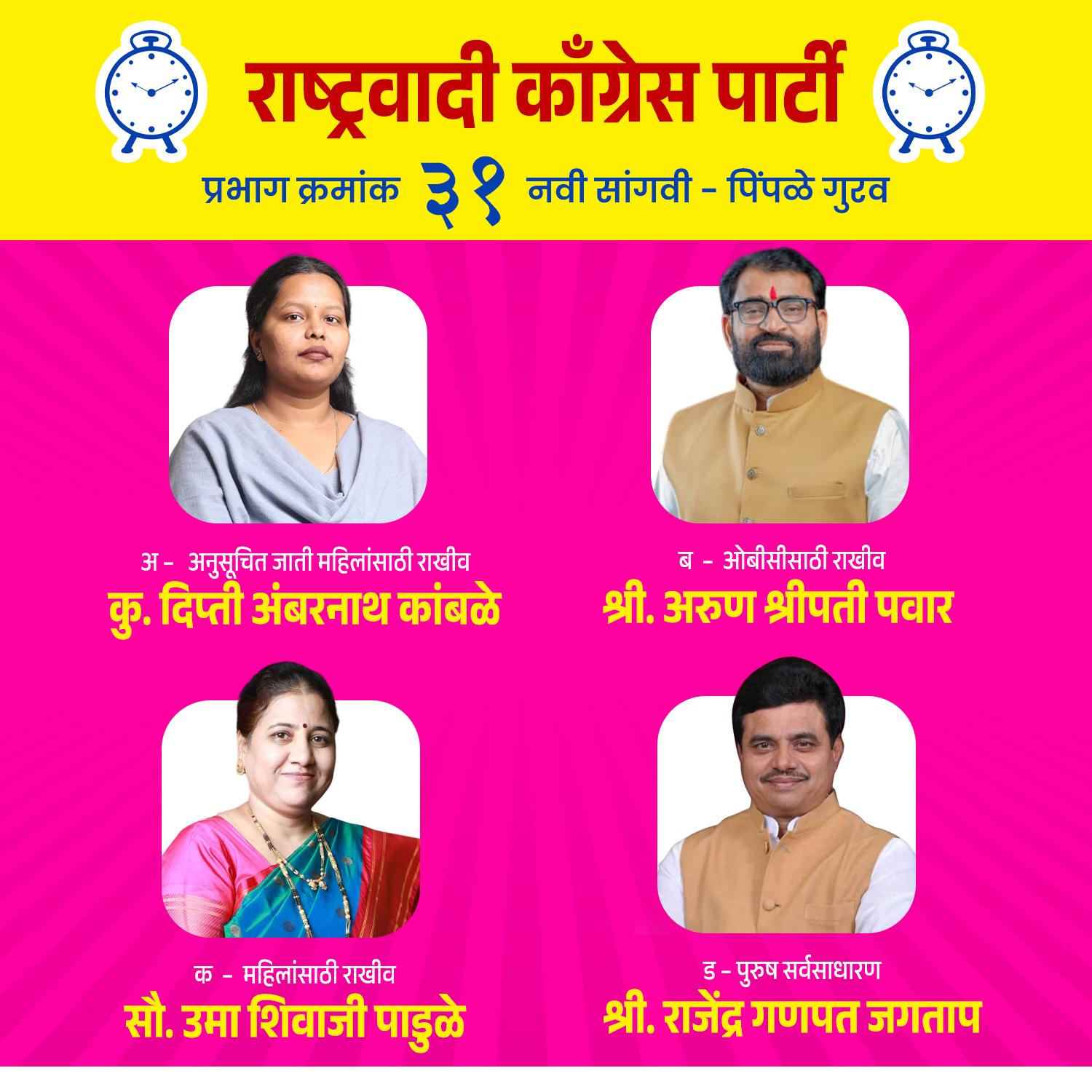 – प्रभागाच्या सर्वांगीण विकासासाठी अनुभवी व जनतेसाठी अहोरात्र झटणारे उमेदवार म्हणून मतदारांचा वाढता पाठिंबा मिळत आहे. त्यामुळे राष्ट्रवादी काँग्रेस पार्टीचे प्रभाग क्र. ३१ चे चारही उमेदवार मोठ्या मताधिक्याने विजयी होतील, असा विश्वास आहे.