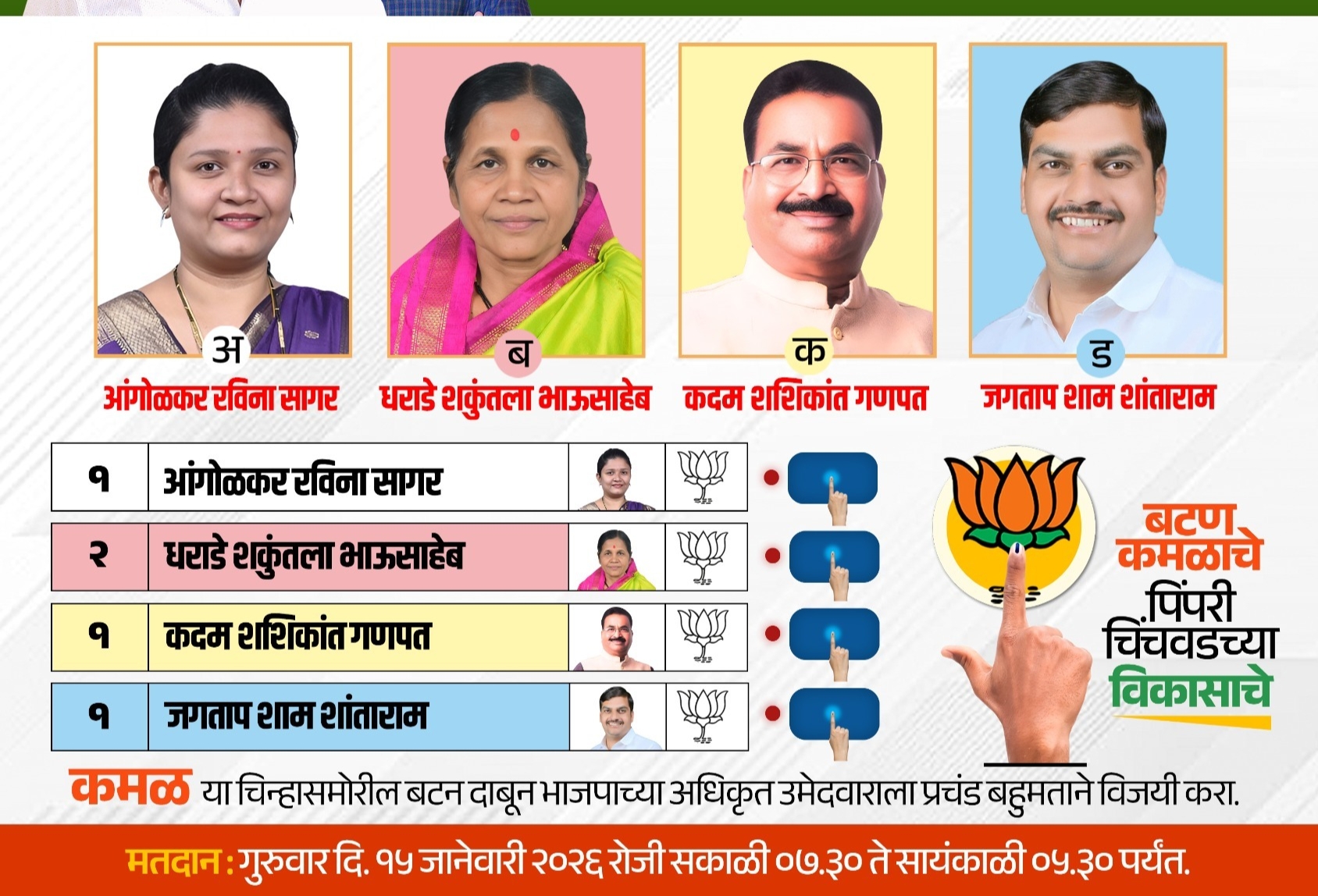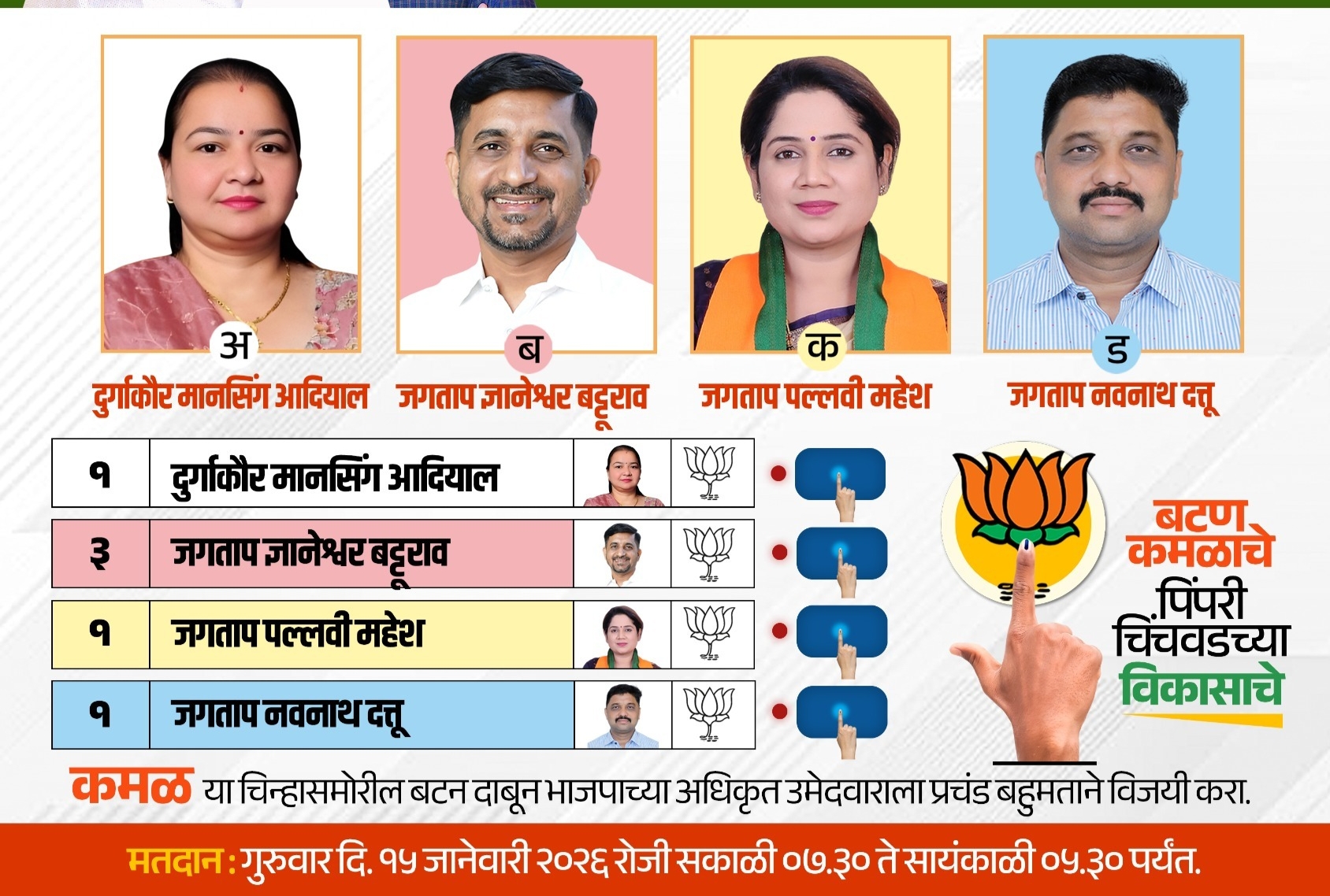 भाजपा व आर.पी.आय. (आठवले) महायुतीकडून प्रभाग क्रमांक २९ मधून आंगोळकर रविना, धराडे शंकुतला, कदम शशिकांत व जगताप शाम , तर प्रभाग 31 मधून माऊली उर्फ ज्ञानेश्वर जगताप, नवनाथ जगताप, दुर्गाकौर अदियाल, पल्लवी जगताप, प्रभाग 32 मधून प्रशांत शितोळे, तृप्ती कांबळे, हर्षल ढोरे, माई ढोरे हे अधिकृत उमेदवार निवडणूक रिंगणात असून, त्यांच्या प्रचाराला या जाहीर सभेमुळे अधिक गती मिळणार आहे. मतदारांनी मोठ्या संख्येने मतदान करून लोकशाहीचा हक्क बजावावा, असे आवाहन यावेळी करण्यात आले आहे.