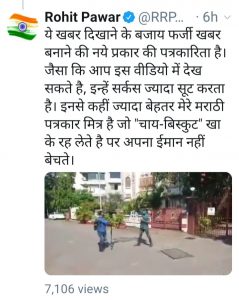 ये खबर दिखाने के बजाय फर्जी खबर बनाने की नये प्रकार की पत्रकारिता है। जैसा कि आप इस वीडियो में देख सकते है, इन्हें सर्कस ज्यादा सूट करता है। इनसे कहीं ज्यादा बेहतर मेरे मराठी पत्रकार मित्र है जो "चाय-बिस्कुट" खा के रह लेते है पर अपना ईमान नहीं बेचते। pic.twitter.com/TOiV4F8iEt