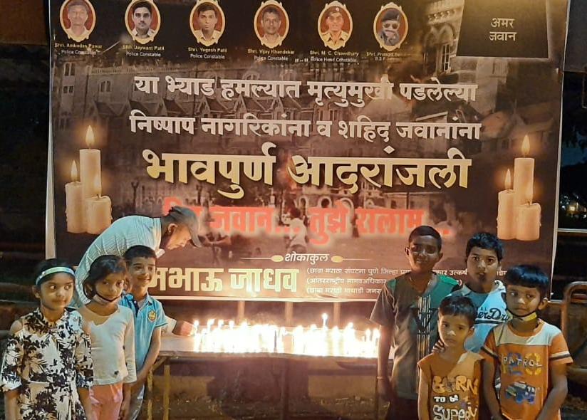 26 नोव्हेंबर 2008 रोजी 10 पाकिस्तानी दहशतवाद्यांनी समुद्रमार्गे प्रवेश करत मायानगरी मुंबईला टार्गेट केले होते. या हल्ल्यामध्ये 34 विदेशी नागरिकांसह 166 जणांना आपला प्राण गमवावा लागला, तर सुमारे 700 जण जखमी झाले. प्राणाची पर्वा न करता लढलेल्या पोलीस जवानांनी 9 दहशतवाद्यांना कंठस्नान घालत, अतिरेकी अजमल कसाब याला जिवंत पकडले. यात 18 पोलीस जवानांना वीरमरण आले. या हल्ल्याला गुरुवारी बारा वर्षे पूर्ण झाली. यानिमित्ताने खडकी येथे आयोजित श्रद्धांजली कार्यक्रमात छावा मराठा संघटनेच्या पदाधिकाऱ्यांसह चिमुकलेही सहभागी झाले होते. मेणबत्त्या प्रज्वलित करून शहिदांना श्रद्धांजली अर्पण करण्यात आली.