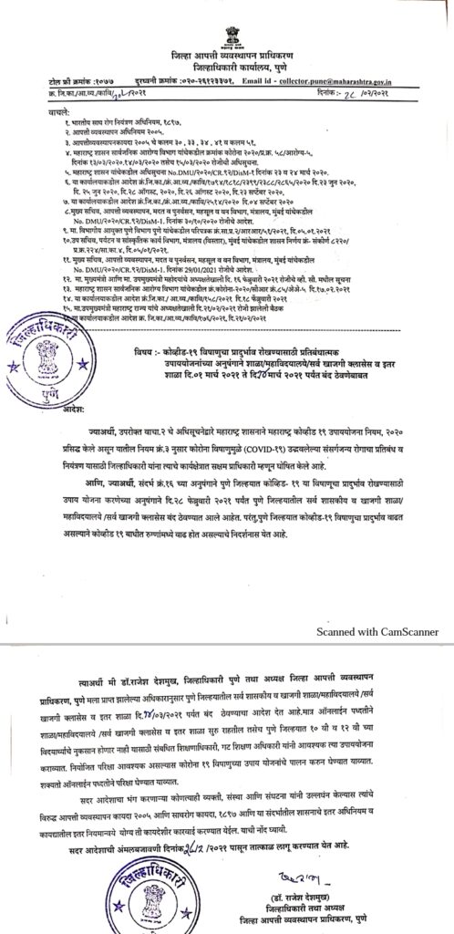 पुणे जिल्हयात कोवीड- 19 या विषाणूचा प्रादुर्भाव रोखण्यासाठी प्रतिबंधात्मक उपाययोजनांच्या अनुषंगाने दि. 28 फेब्रुवारी 2021 पर्यंत पुणे जिल्हयातील सर्व शासकीय व खाजगी शाळा, महाविद्यालये, सर्व खाजगी क्लासेस बंद ठेवण्यात आले आहेत. परंतु, पुणे जिल्हयात कोवीड-19 विषाणूचा प्रादुर्भाव वाढत असल्याने कोवीड 19 बाधीत रुग्णांमध्ये वाढ होत असल्याचे निदर्शनास येत आहे. पुणे जिल्हयातील सर्व शासकीय व खाजगी शाळा, महाविदयालये, सर्व खाजगी क्लासेस व इतर शाळा दि.14 मार्च 2021 पर्यंत बंद ठेवण्याचा आदेश देण्यात येत आहेत, मात्र ऑनलाईन पध्दतीने शाळा, महाविदयालये, सर्व खाजगी क्लासेस व इतर शाळा सुरु राहतील तसेच पुणे जिल्हयात 10 वी व 12 वीच्या विदयार्थ्यांचे नुकसान होणार नाही यासाठी संबंधित शिक्षणाधिकारी, गट शिक्षण अधिकारी यांनी आवश्यक त्या उपाययोजना कराव्यात. नियोजित परिक्षा आवश्यक असल्यास कोरोना 19 विषाणुच्या उपाययोजनांचे पालन करुन घेण्यात याव्यात. शक्यतो ऑनलाईन पध्दतीने परिक्षा घेण्यात याव्यात, असेही आदेशात म्हटले आहे.