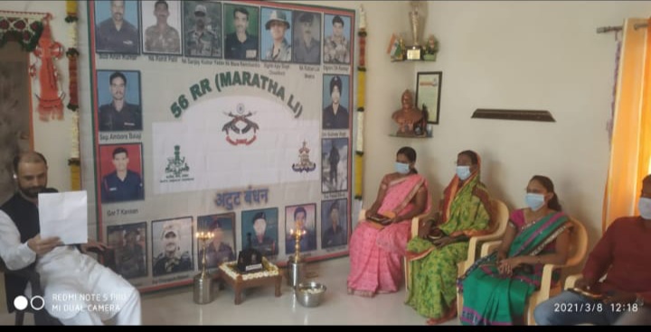 पुणे,दि.१२( punetoday9news):- ५६ (RR) राष्ट्रीय रायफल मराठा लाईट इन्फंट्री आणि तोफखाना विभाग यातील माच्छाल, कुपवाडा,काश्मीर या परिसरामध्ये शहीद झालेल्या परिवारातील वीर माता आणि वीर पत्नींचा सन्मान करण्याचा अतूट बंधन कार्यक्रम ऑनलाईन घेण्यात आला.